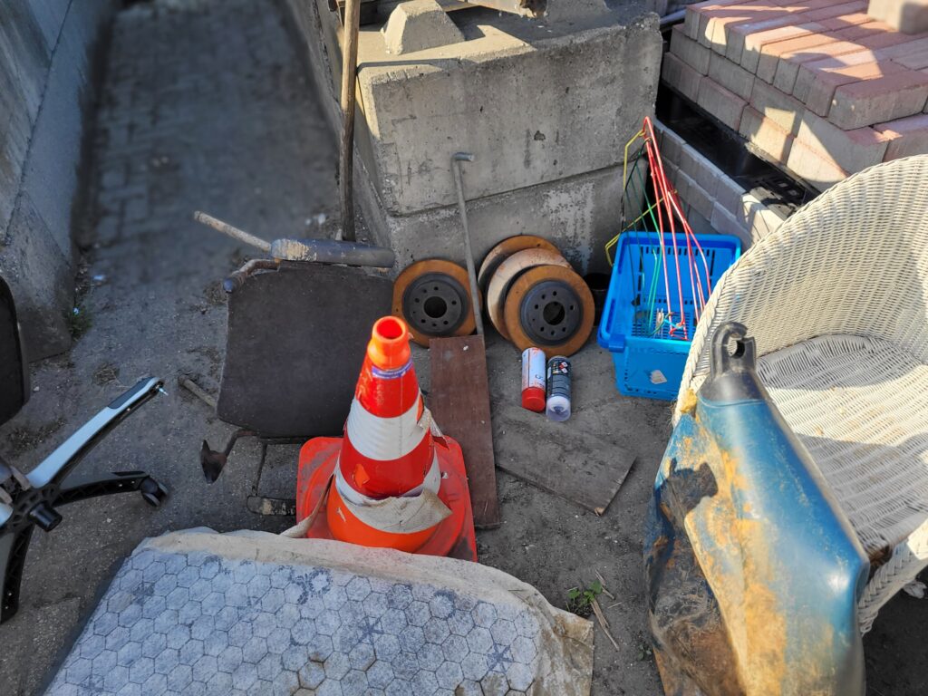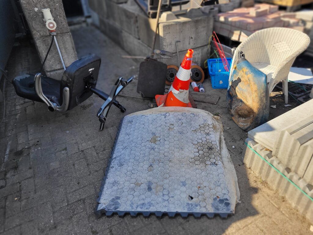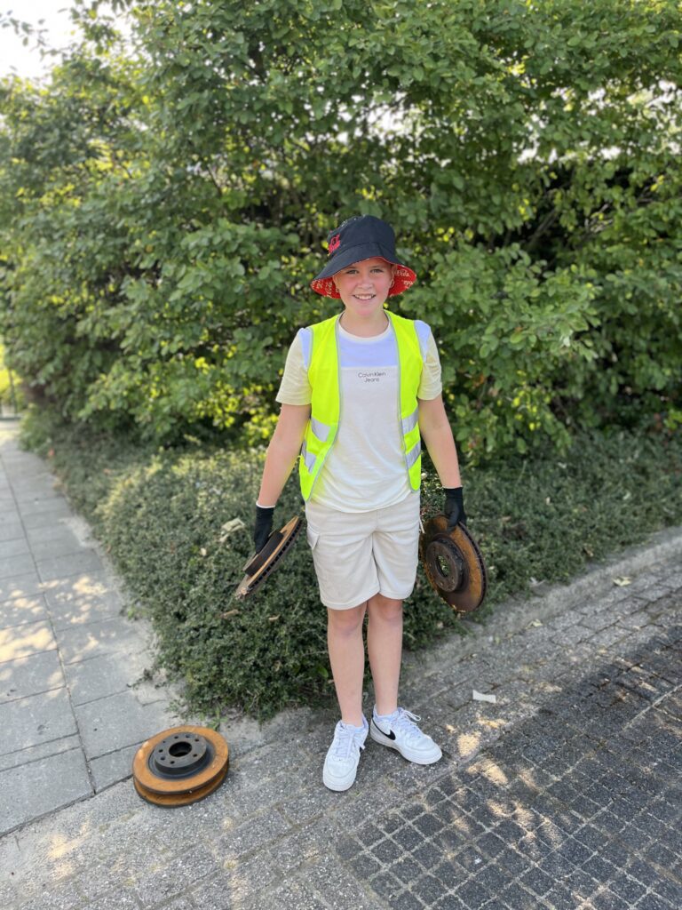 Bijzondere zaken waren er natuurlijk ook weer zoals een witte rieten stoel, een AH-mandje, een droogrek, een oude bureaustoel, een hele oude stoel, 2 verfspuitbussen, veel karton, een stalen pen, een grote pillon, een kunststof rastermat langs de rivier net als een grote bolfender ( om een boot te beschermen bij aanleggen ). Het gekste wat gevonden werd waren 4 grote zware schijfremmen in de bosjes bij de Alblashof. Job moest zelfs zijn karretje gaan halen om dit thuis te krijgen. Hoe verzin je het toch.