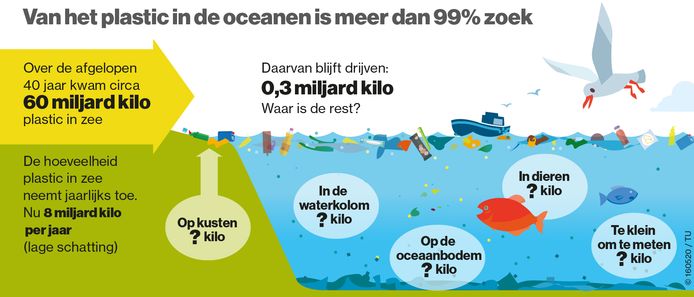 Elk jaar spoelt er zo’n 8 tot 10 miljard kilo plastic in de oceaan. Erik van Sebille brengt in kaart waar het allemaal blijft. ,,Liefst 99 procent van al dat plastic is zoek’’, aldus de oceanograaf.